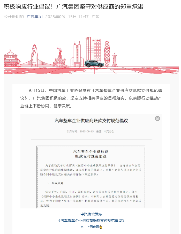 9月15日,包括广州汽车集团有限公司在内的八家车辆制造商,比亚汽车行业有限公司,理想汽车公司,Dongfeng Automobile Group Co,Ltd.等等,一步一步地说,他们积极实施“汽车企业供应商帐户付款标准计划”,建立“获胜的车辆零件”协作和双赢开发生态系统,并共存高质量的工业发展。目前这八家公司的具体陈述如下:GAC在9月15日,中国汽车制造商协会发布了“汽车付款付款完整的汽车Enterpliers汽车完整帐户的完整帐户”。 GAC集团正在积极响应,稳定的支持者实施-top倡议,并促进了协调和健康的flowi通过实用的行动NG和沿工业链。在工业连锁店中,健康明清的金融融资是确保高安全性,高质量和使用车使用者使用的重要基础。自1997年成立以来,GAC集团一直遵守“帐户中不超过60个帐户供应商”的支付原则,并严格执行了28年,以实用的行动和维持供应链稳定性履行公司责任。 GAC集团已经建立了一个完整的程序控制系统,涵盖订单发布,收据验证,对帐和还款付款,并依靠数字平台实现整个视觉管理管理,以消除任何形式的付款延迟。购买GAC产品是购买质量,并继续遵守您的业务。看来,GAC集团将继续遵守诚实的行动和行动,遵循SUP的庄严承诺钳子,与工业连锁店的开花和下游合作伙伴一起建立一个开放,透明,协作和高效的开放式,以及该行业的双赢生态系统,并注入长期的中国。最近,工业和信息技术部以及其他国家部长和委员会做出了一系列的决定和维修,以确保工业链和供应链的稳定性,并促进高质量的开发NG车辆行业。 On September 15, the China Association of Automobile Manufacturers released the "Account Payment Standards Initiative for Automobile Complete Vehicle Enterprises suppliers, which passes standard initiative initiatives with the accountable content of account payment to contracts between vehicle companies and supply chain companies. Byd Auto actively responds to the "Initiative of the supplier payment criteria", implemented the "regulations of guarantee of small and medium business payments",关注基本链接,例如遵守以下合并,交付和接受,付款和谈判以及合同条款。通过技术变革和管理的优化,我们将与鲜花和鲜花合作,共同开发Bydauto的双赢开发生态系统,并促进中国车辆行业的高质量发展。完美的完美汽车正在积极回应协会倡议和行业和信息技术部的呼吁,并确定了工业和信息技术部的指南精神。我们将继续履行我们致力于在60天内支付账单的承诺,严格执行诸如及时接收商品,和解与谈判之类的标准,并确保合作伙伴在心灵上安心并坚定地发展。我们知道,合作伙伴的信任和支持是使完美汽车前进的动力。将来,我们将将与流动和下游的企业合作,以促进更稳定的,有用和双赢的合作,共同卫生,可持续和高质量的汽车行业生态系统以及工业发展的股息。 DONGFENG 9月15日,中国汽车制造商协会发布了“汽车完整汽车企业的汽车供应商的帐户付款标准计划”,该计划为开发了“全能冠军”的“完整车辆”的生态系统提供了明确的指南,并促进了高质量的车辆开发。 Ang Dongfeng Motor Group Co,Ltd(Mula rito ay tinukoy bilang“ dongfeng Motor”)Na aktibong tumugon sa inisyatibo,ipatutupad ang Mga kinakailangan sa inisyatibo sa inisyatibo sa mga sa mga pangunaing PAG -AREGLO,在Termino Ng Kontrata,Epektibong Protektahan ang Mga Karapatan,Interes Ng供应商,Patatagin Ang Mga Inaasasahan NG供应商,Mapahusay Ang Ang ResilienceAin ng pang -industryes。作为中央政府下方的超级大型车辆,Dongfeng Motor将通过实际行动来执行中央企业的责任,扮演工业连锁店的“连锁领导者”,继续优化工业生态,增强工业现代技术和供应链链链链技术系统的建设。共同促进高质量的工业发展。 SAIC最近,工业和信息技术部,国有州和行政管理委员会以及其他州部长以及委员会做出了一系列的决策和维修,以确保工业链和供应链的稳定性,并促进高质量的汽车行业发展。 2025年9月15日,中国协会制造商ORF Automobile发布了“车辆供应商的帐户付款标准倡议”,该计划已将倡议倡议通过了车辆公司和供应链公司之间的帐户付款合同负责。 2025年6月,SAIC集团正式宣布将在60天内团结付款期,并且没有采用监管程序,例如增加金融压力的商业认可措施。 In the future, the Saic Group will continue to activate the requirements of the "regulations on guaranteeing the payment of funds for small and medium enterprises" and respond to the "automotive vehicle enterprise supplier account payment standard initiative" with practical actions, focus on key links such as order confirmation, deliver and deliver Acceptance, Payment and Settlement, andContract term, promote the high-quality and efficient flow of funds from upstream and downstream enterprises, lay a solid供应链协调发展的基础,并与大多数生态系统合作伙伴合作,以促进高质量和可持续发展中国汽车行业的关注。 The Chery Chery Group actively responds to "Initiative for Payment of Accounts for supplier vehicle enterprises" issued by the China Association of Automobile Manufacturers on September 15, which promises that contract agreements with major links such as sequence confirmation, delivery and receipt, payment and reference, and contract terms, implement the requirements " Combine small and medium business "and build a win-win development ecosystem for" joining parts of the vehicle".最近,相关的国家部长和委员会创建了一系列维修,以确保工业和供应链的稳定性,并促进车辆行业的高质量发展。 Chery Group采取了实践行动实施了国家扩张和行业计划。通过创新的步
