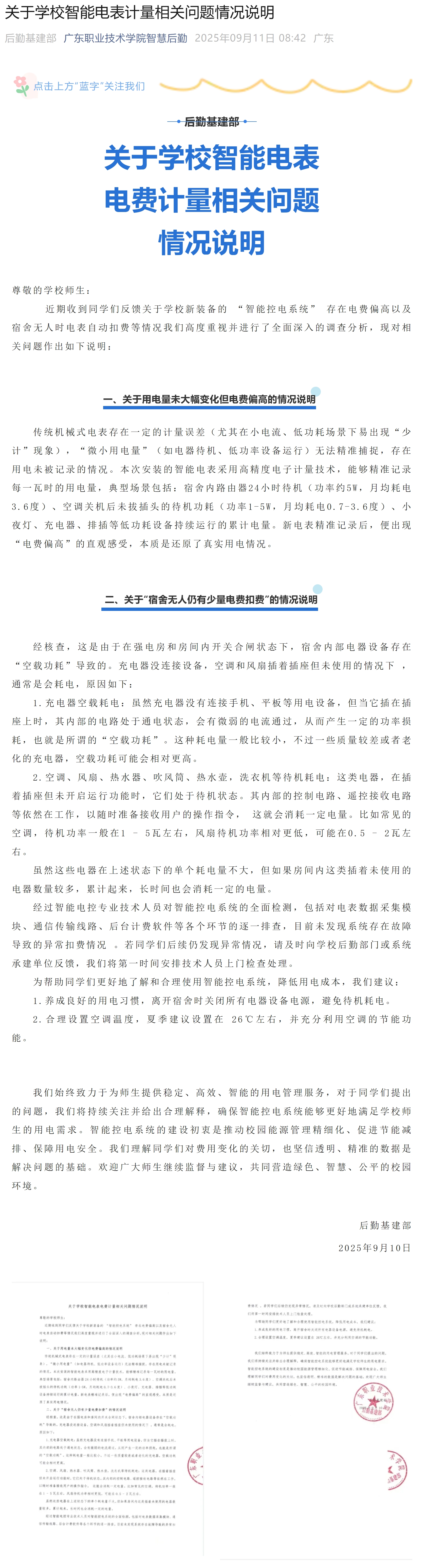 9月11日,广东职业和技术学院的官方物流基础设施部门的官方微型计算机发布了“关于智能智能智能智能电表仪表的指示”(定义的“指令”),向学校的新设备解释了高中的电力“智能电力控制系统”,何时不知道如何控制电力电量时的电力何时不知道如何控制电动机的电力,并且在电力仪上的电力范围不足时,”宿舍不知道如何控制电力”和当不给宿舍进行时自动减功率。描述指出,传统机械仪表有一些测量误差(尤其是在小型电流和低功耗情况下,“最小电力消耗”的现象(例如,电力备用和低电力操作)是不可接受的,并且是电力的重点,而电力是电力的重点有绳。记录没有相同独家场景的电源。夜灯,Thosecharger和插头等低动力设备。太高”,“本质是恢复功耗的真实情况。 “关于“宿舍中没有人仍然有少量的电费减少”的问题,解释说,经过验证后,当在牢固的房间中切换并关闭房间时,它是由宿舍内电动设备的“无电力负载”引起的。