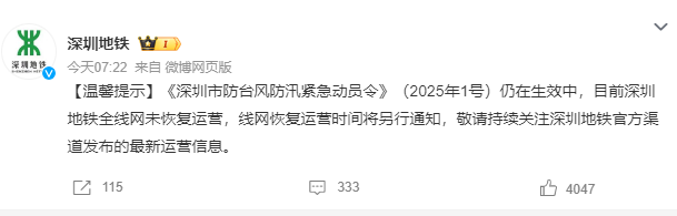 今天早上(24),@shenzhen Metro发布了热门提醒:“深圳台风和洪水控制紧急动员命令”(2025年第1号)仍然有效。目前,整个深圳地铁网络尚未继续操作,网络继续运营的时间将分别给出。请继续关注深圳地铁官方频道发布的最新操作信息。资料来源:@shenzhen地铁