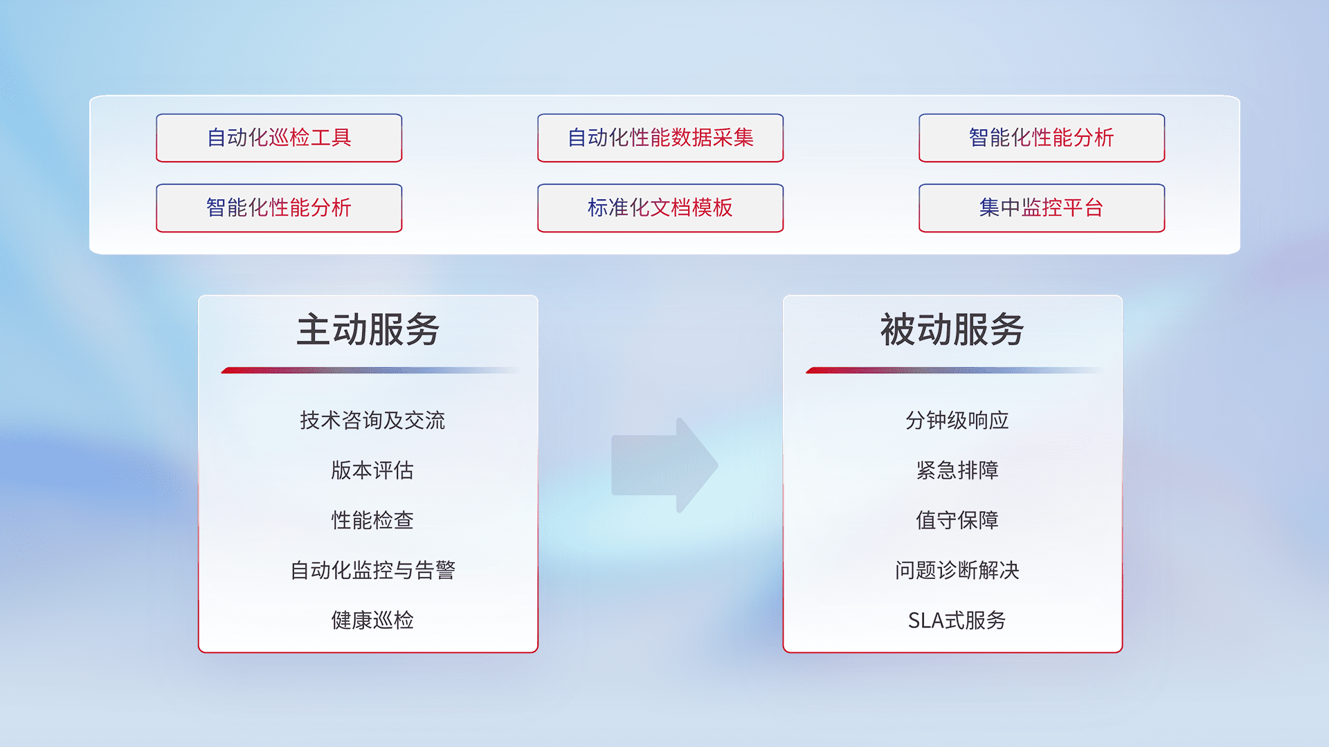 智能化工具和标准化文档,,保障服务质量,,提供主动服务(包含技术咨询、、、、版本评估、、性能检查、、、、自动化监控与告警、、、、健康巡检)和被动服务包含(分钟级响应、、紧急排障、、值守保障、、、、问题诊断解决、、、、SLA服务)。。。。